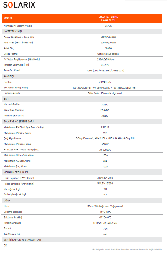 Tunçmatik Solarix 3.6kW 24V MPPT 100A Off-Grid Akıllı İnverter